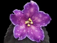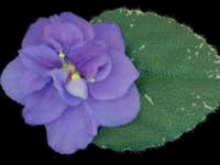 Semidouble stars in tones of blue-purple, have frilly white edges. A heavy blooming semiminiature with deep green, pebbly & pointed foliage, sporting a red reverse.