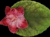 Semidouble, light maroon/red pansies, with a darker shading of maroon on the petal tips. Each flower is covered with blue fantasy flecks. The semiminiature foliage is light green with Champion variegation. An unusual and pretty variety! 3rd Best New Cultivar, 2010 AVSA convention in Raleigh, NC