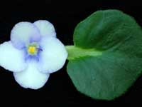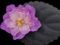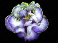 Double white stars with a light blue mottling throughout. Light green foliage shapes nicely and is serrated. A good bloomer and an excellent show plant! Semiminiature.