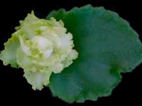 A powerhouse of small, bright green, double flowers accented with varying amounts of white in the centers, have deeply fringed edges and blanket ruffled, semiminiature, medium green foliage. We are extremely proud of this prolific little gem! 2nd Best New Cultivar, 1990 AVSA convention in Boston Best New Cultivar, 1990 NYS convention Also in the 1992 & 1993 AVSA 'Best Varieties List'