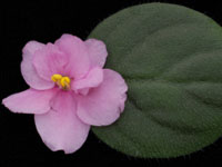 Semidouble light pink sticktite pansy/bright blue fantasy. Medium green, quilted. Semiminiature trailer. Excellent for show!