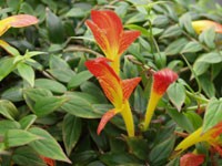 Bronzy and green leaves with golden flowers that show a scarlet overlay. This variety grows large.