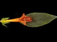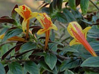 Wine red hairs cover the branches of this variety. The corolla has wine red hairs outside with lemon yellow tubes, wine red at the base, and scarlet edging upon the lobe edges. Dark green foliage.