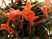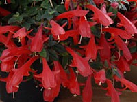 Commonly called "dancing dolphins" or "Shark Plant" because of the interesting bloom shape. Columnea flowers come in striking shades of red, orange, yellow and combinations of these colors, and most varieties will make nice hanging basket plants. South and west windows are best for compact growth. Requirements for artificial lighting is 12 to 14 hours daily. Baskets may be grown outdoors in shaded areas during the summer. Let soil become slightly dry between waterings. Use a light porous potting mix. Feed plants regularly, using a well balanced fertilizer, at ¼ tsp. per gallon of water, with every watering. Fertilizer may be increased to ½ to 1 full tsp. per gallon of water during spring and summer, when plants are actively growing, depending upon the size of the plant. (Larger plants can handle more fertilizer.)