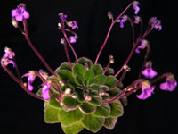 Originating in Indo-China, these compact gesneriads, affectionately referred to as "pets", have blooms reminiscent of wild violets and symmetrical growing habits. We find that they grow very well with low to medium light levels, cooler temperatures, and a minimum of water and fertilizer. Requirements for artificial lighting would be around 8 to 10 hours. They will do well on the bottom shelf of "light stands" and near the end of the fluorescent light tubes. Use a light, porous potting mix, and grow them in small pots! Let the soil become fairly dry between waterings. They also do very well when "wick watered." Feed plants regularly, using a well balanced fertilizer, at ΒΌ tsp. per gallon of water, with every watering.