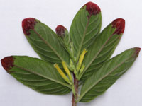 Single white with a blue edge. Variegated medium green and white, serrated. Standard